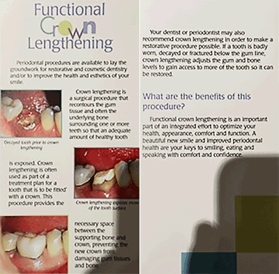 Crown lengthening is a surgical procedure that recontours the gum tissue and often the underlying bone surrounding one or more teeth so that an adequate amount of healthy tooth is exposed. Crown lengthening is often used as part of a treatment plan for a tooth that is to be fitted with a crown. This procedure provides the necessary space between the supporting bone and crown, preventing the new crown from damaging gum tissues and bone.